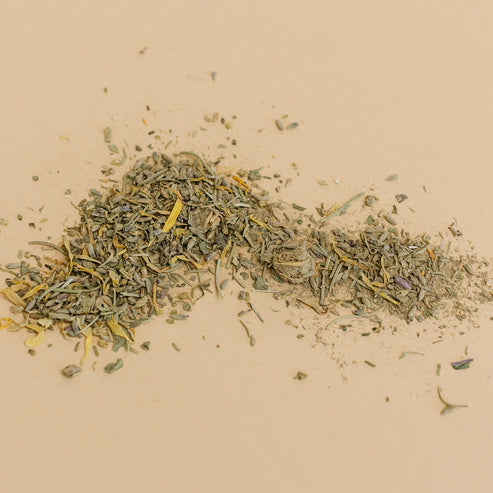 100% Organic + Wildcrafted: Rosemary, Oregano, Aloe Vera, Calendula (Marigold), Lavender Buds, Dandelion Leaf, Yarrow.